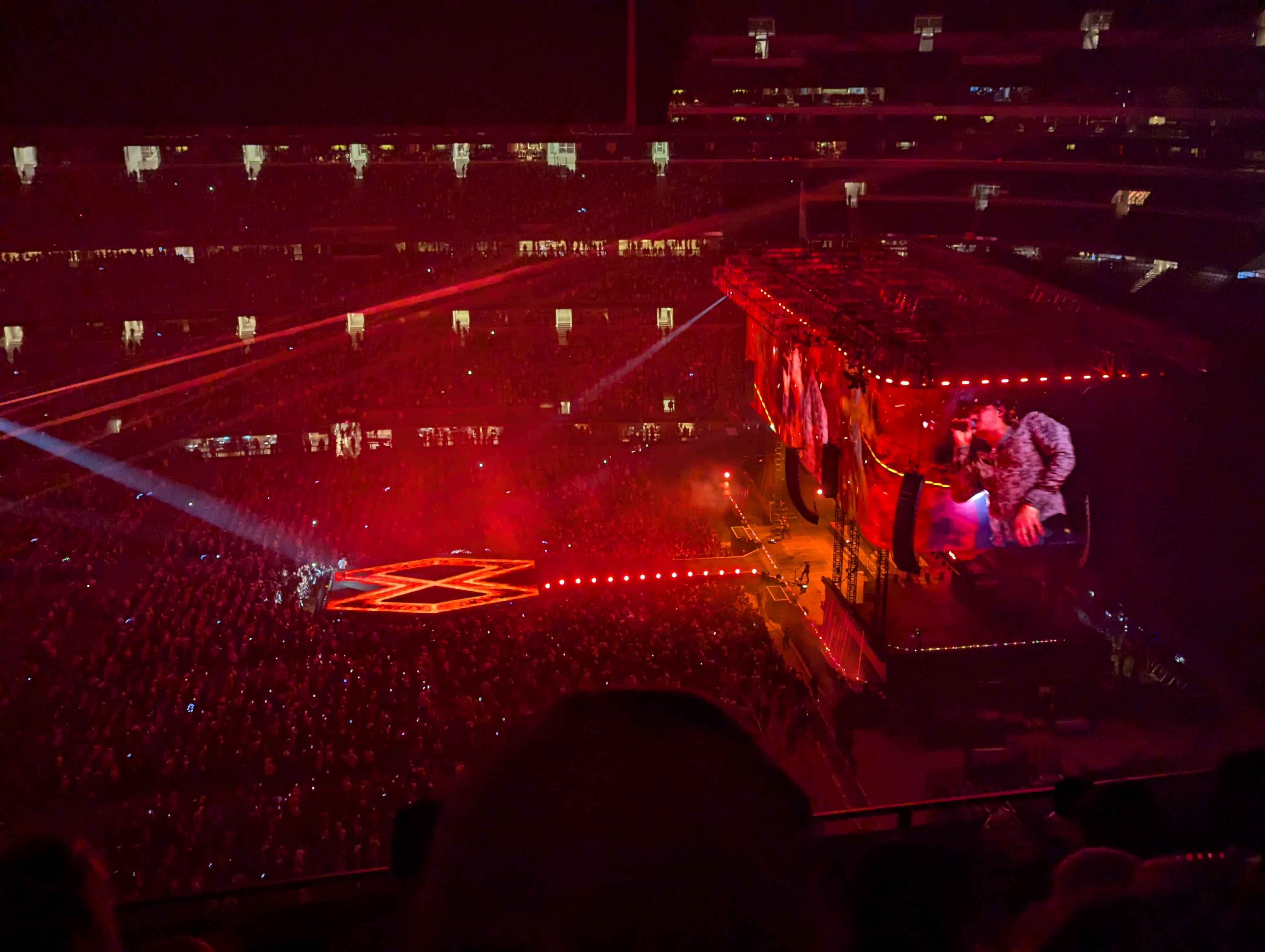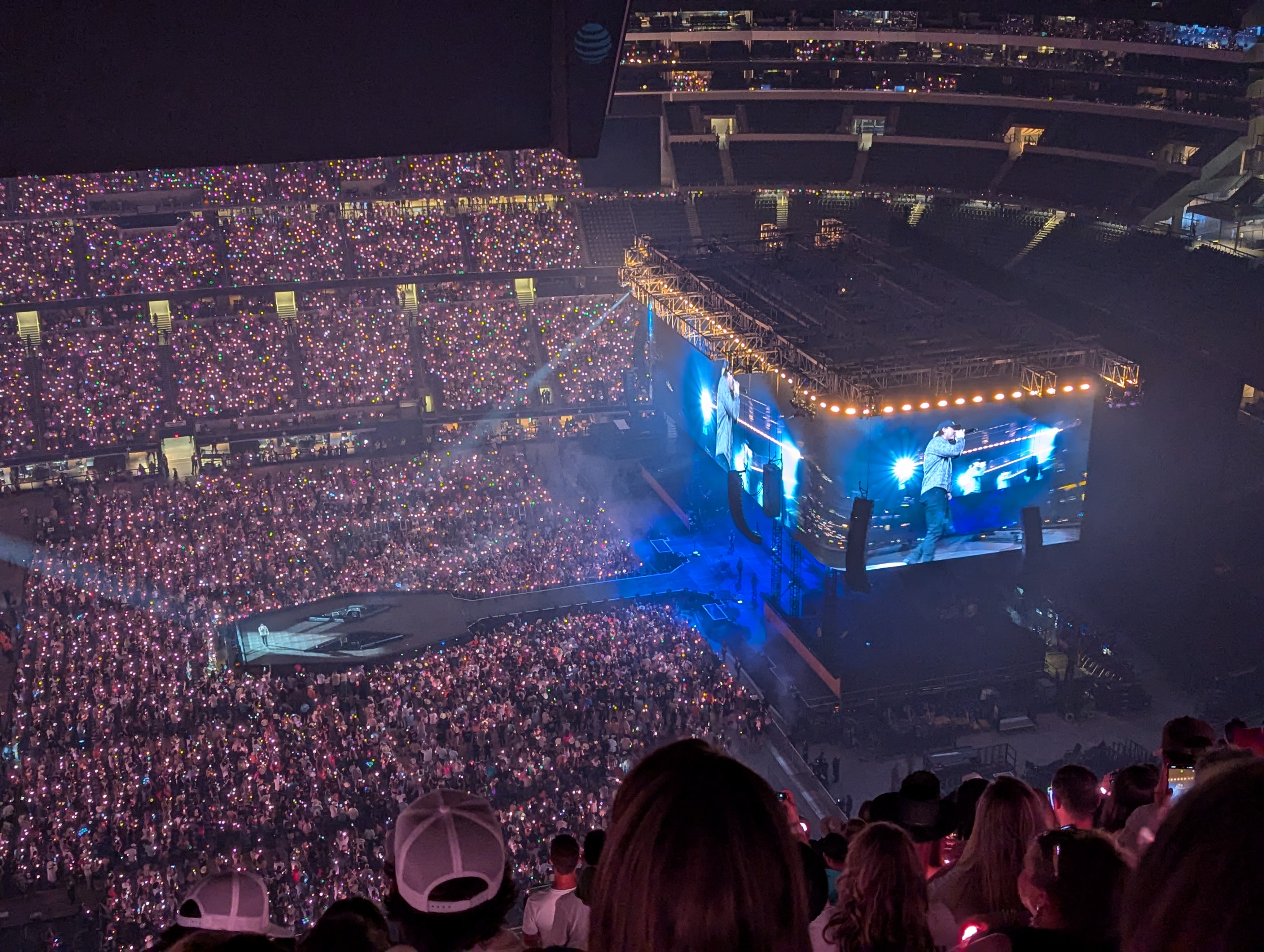 Our seats were WAY up at the very top of the stadium. Fortunately for the girls, the Teames family had tickets in the lowest section directly out from the stage and when people near her left after Jelly Roll’s opening act, she told them to come sit by her. Michelle and I stayed up in the nose-bleeds.